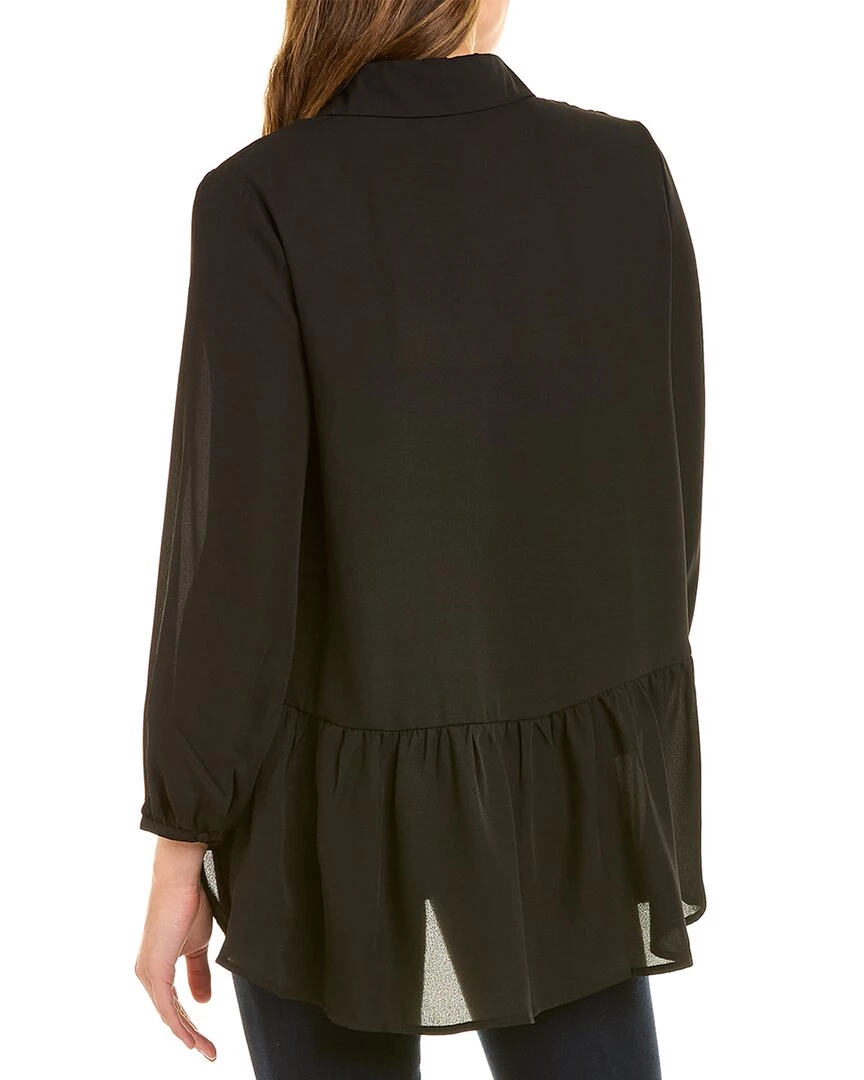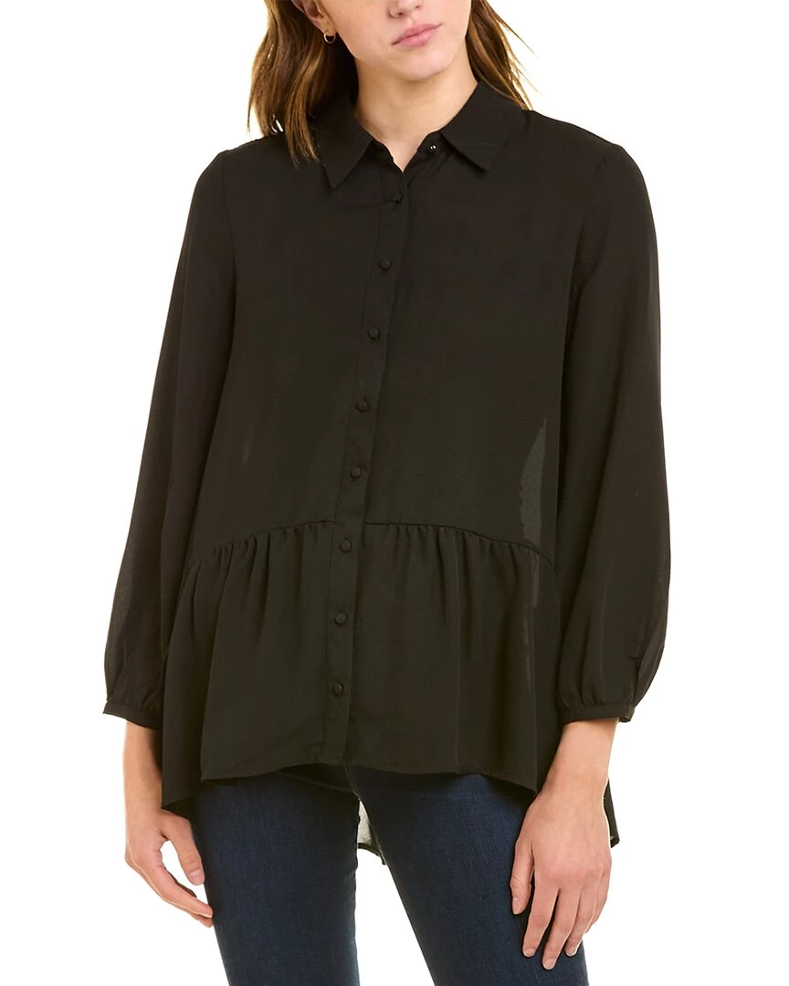 - Button-Down Blouse In Black With Spread Collar, Button Cuffs, And Shirred High-Low Hem