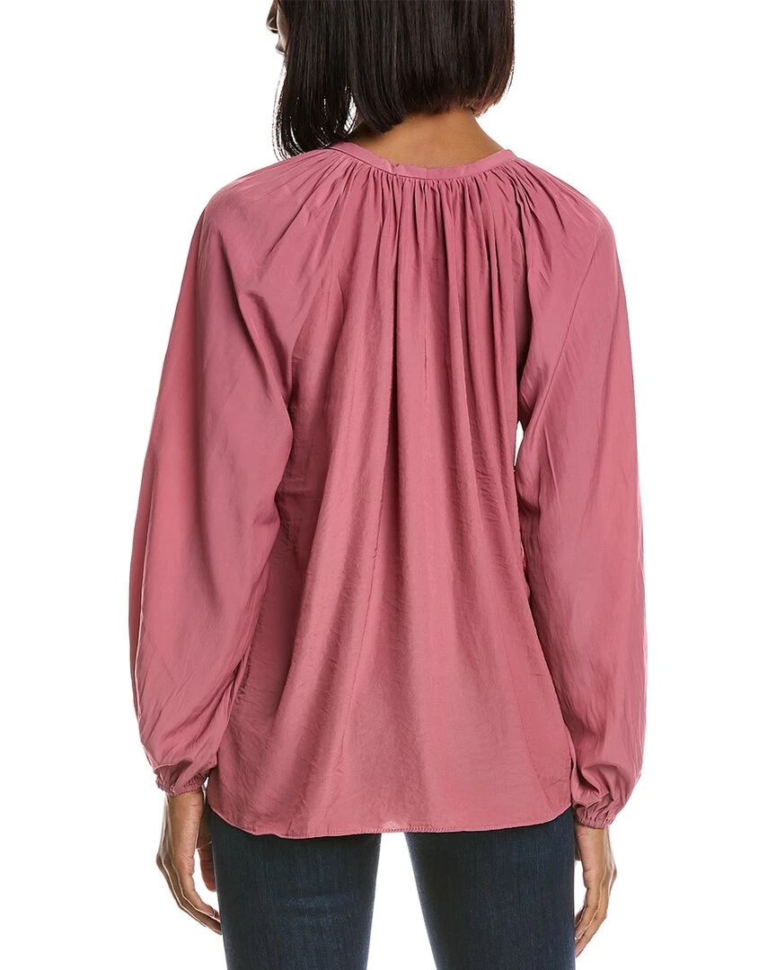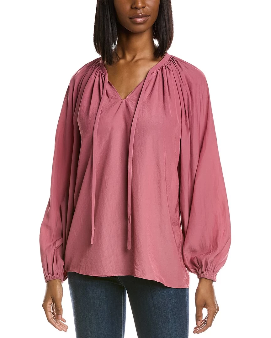 - V-Neck Blouse In Berry With Self-Tie Keyhole Neck, Blouson Sleeves, And Elasticized Cuffs